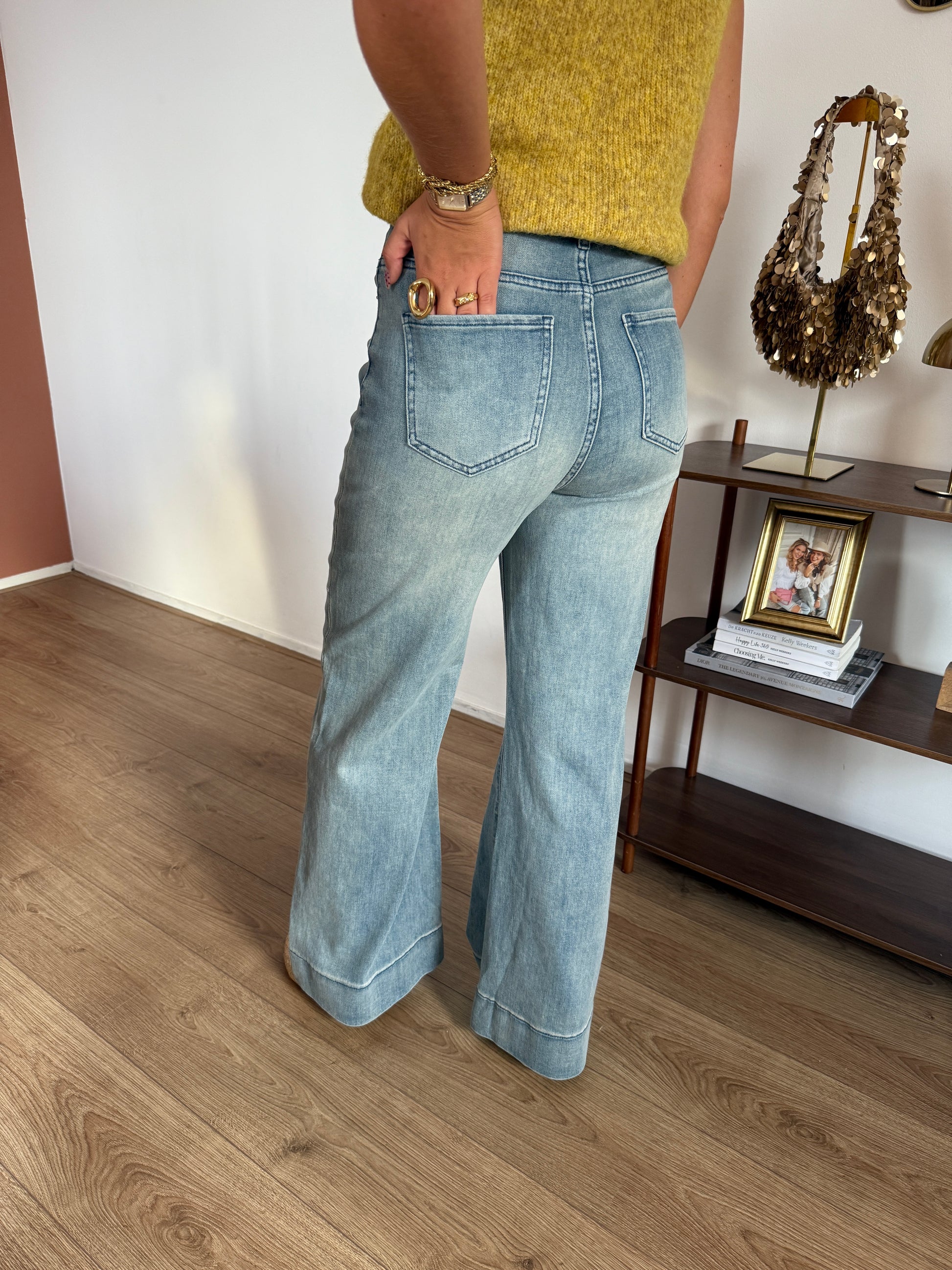 Trendy & comfortabel! Deze high waisted wide leg jeans in een medium blauwe kleur heeft veel stretch en valt ruim. Verkrijgbaar in S/M en M/L voor de perfecte fit.