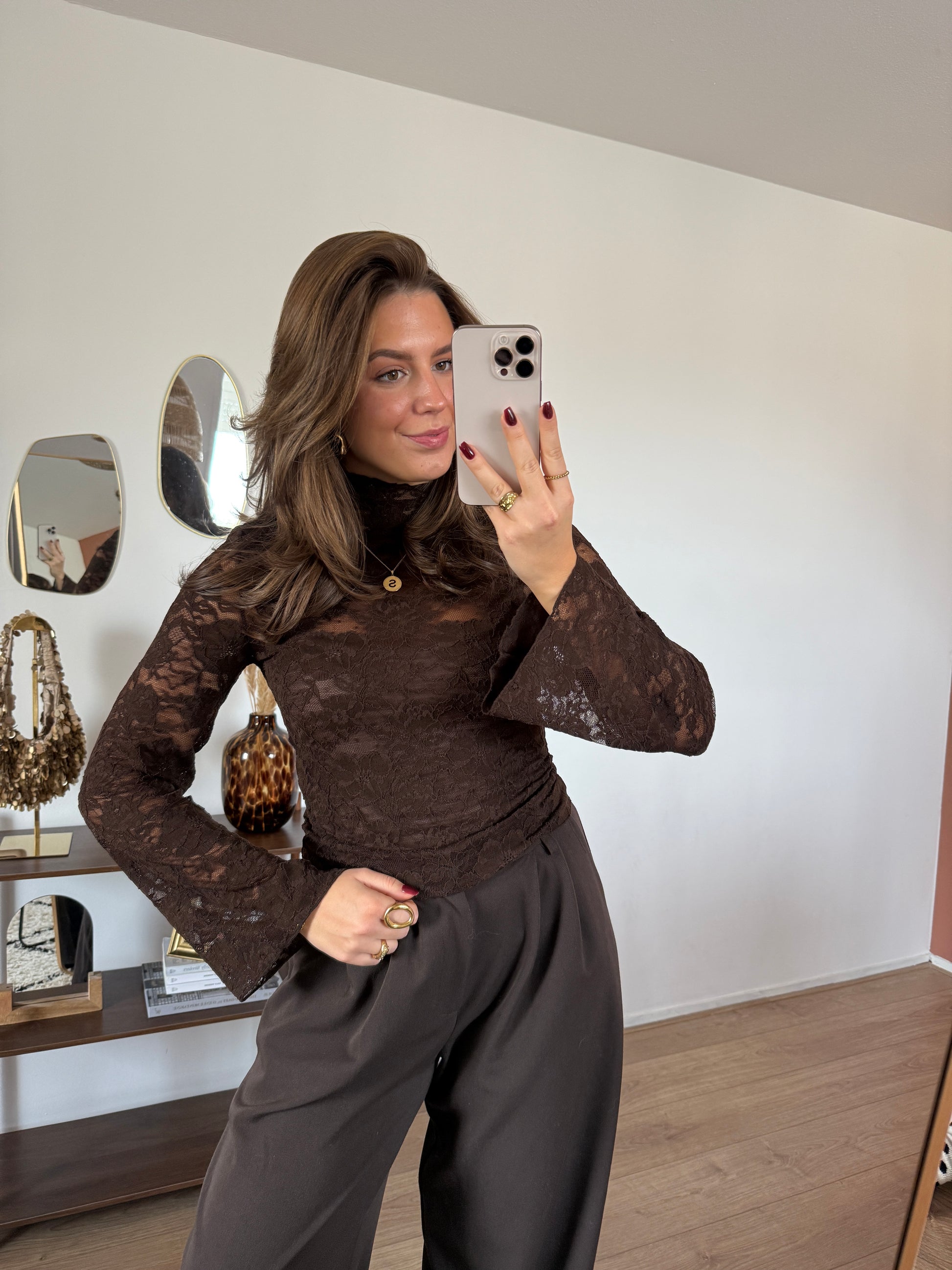 Kanten top met wijde mouwen - donkerbruin