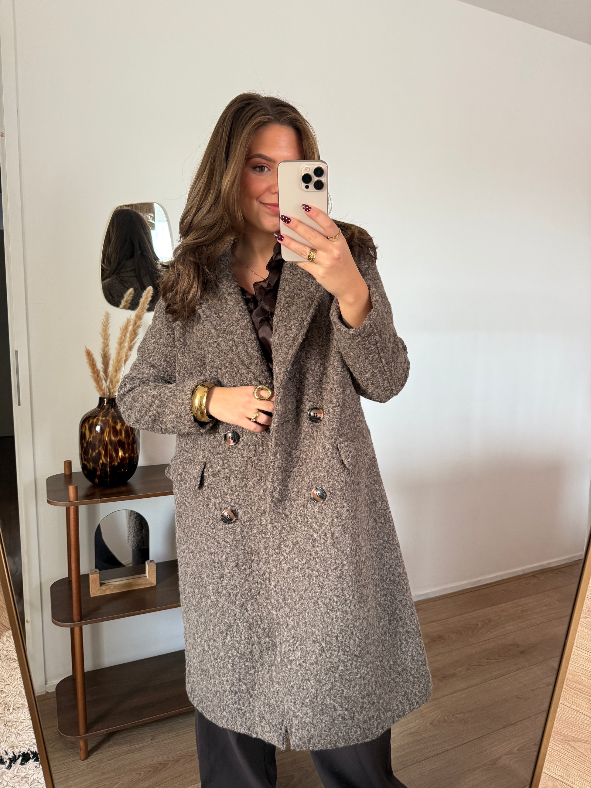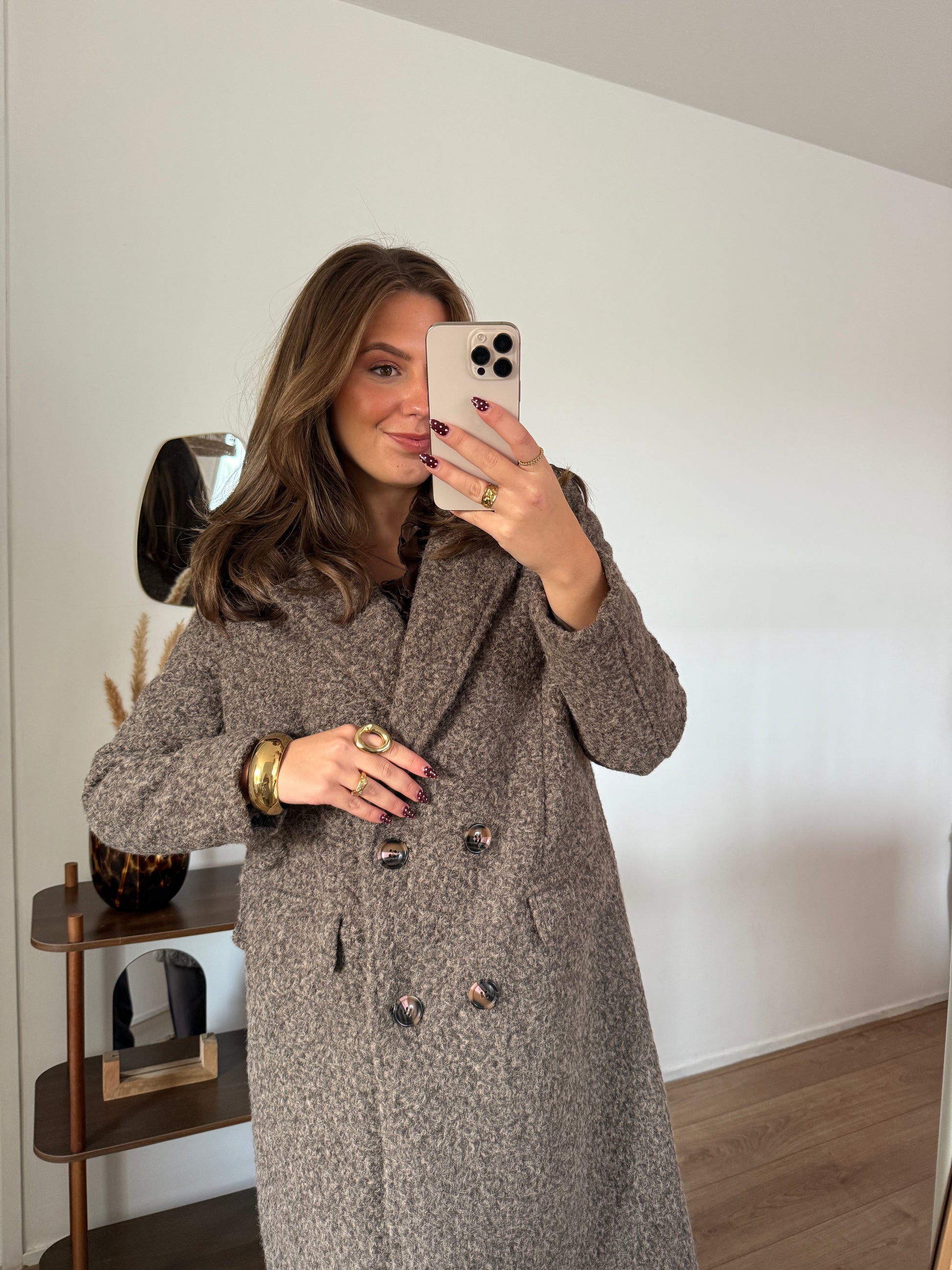 Stijlvol & tijdloos! Deze bruine manteljas van zacht, wollig materiaal heeft een mooie lengte en is makkelijk te combineren. One size, draagbaar tot en met maat 42.
