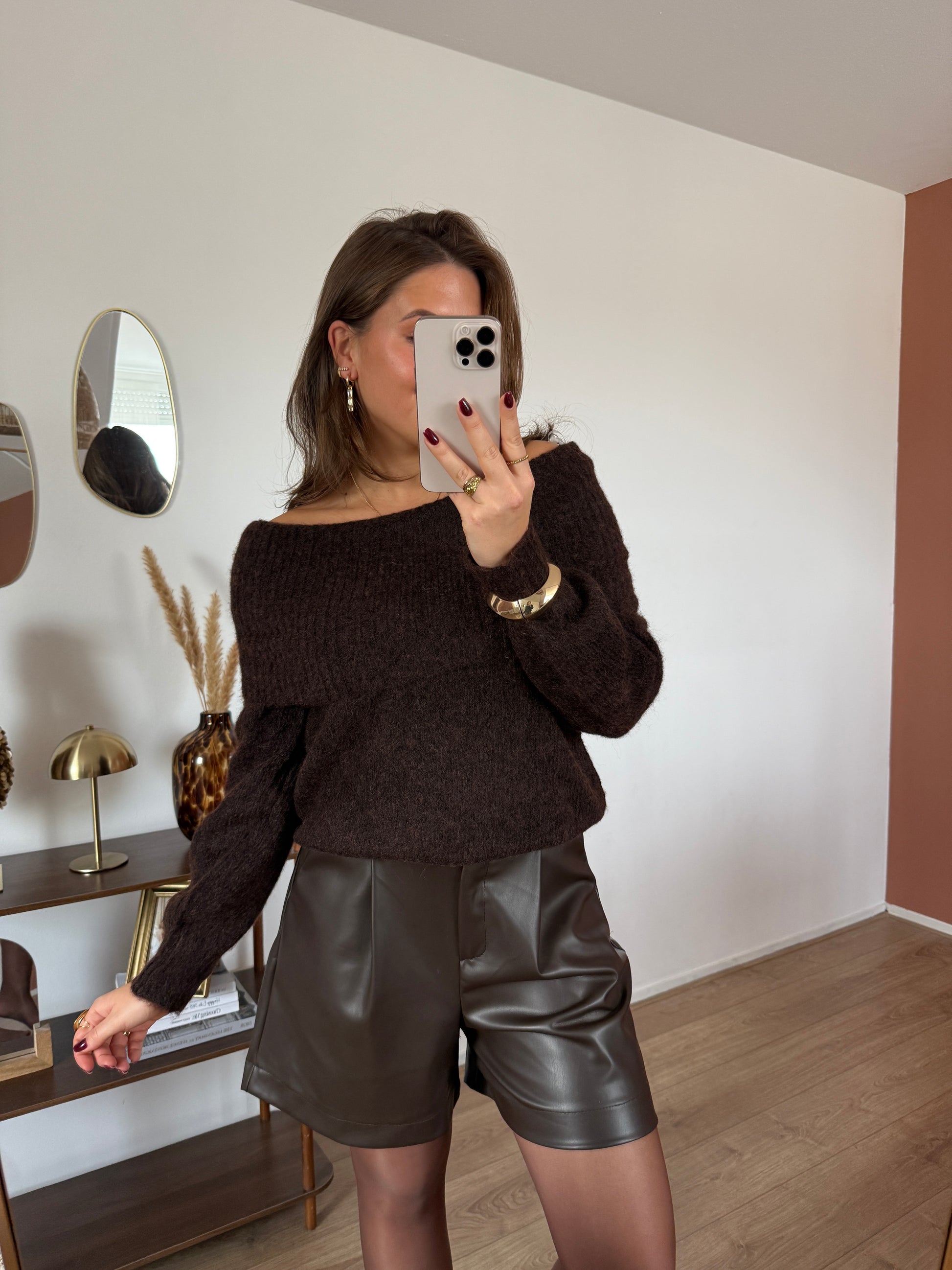 Fluffy off-shoulder trui - bruin