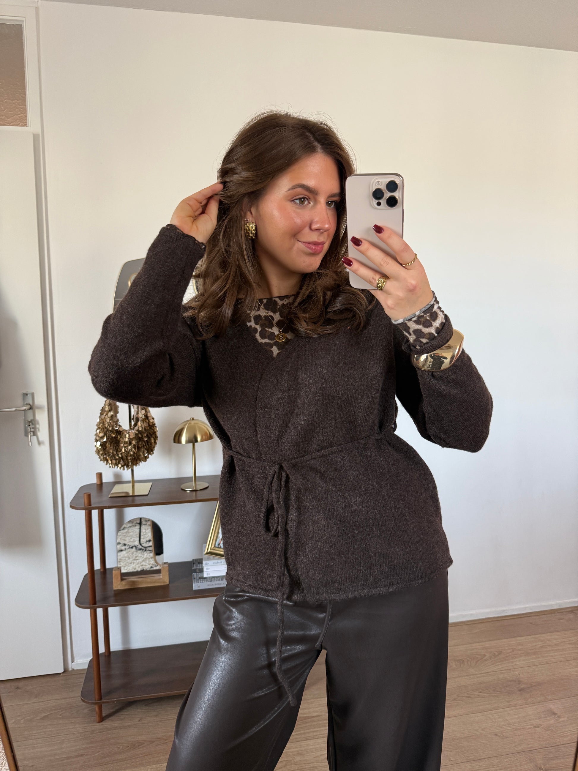 Dit overslagvest in donkerbruin is mega cozy! ✨ Het langere model valt mooi over de heupen en zorgt voor een comfortabele pasvorm. Perfect om casual te dragen over een top en jeans of als extra laagje over een jurk.