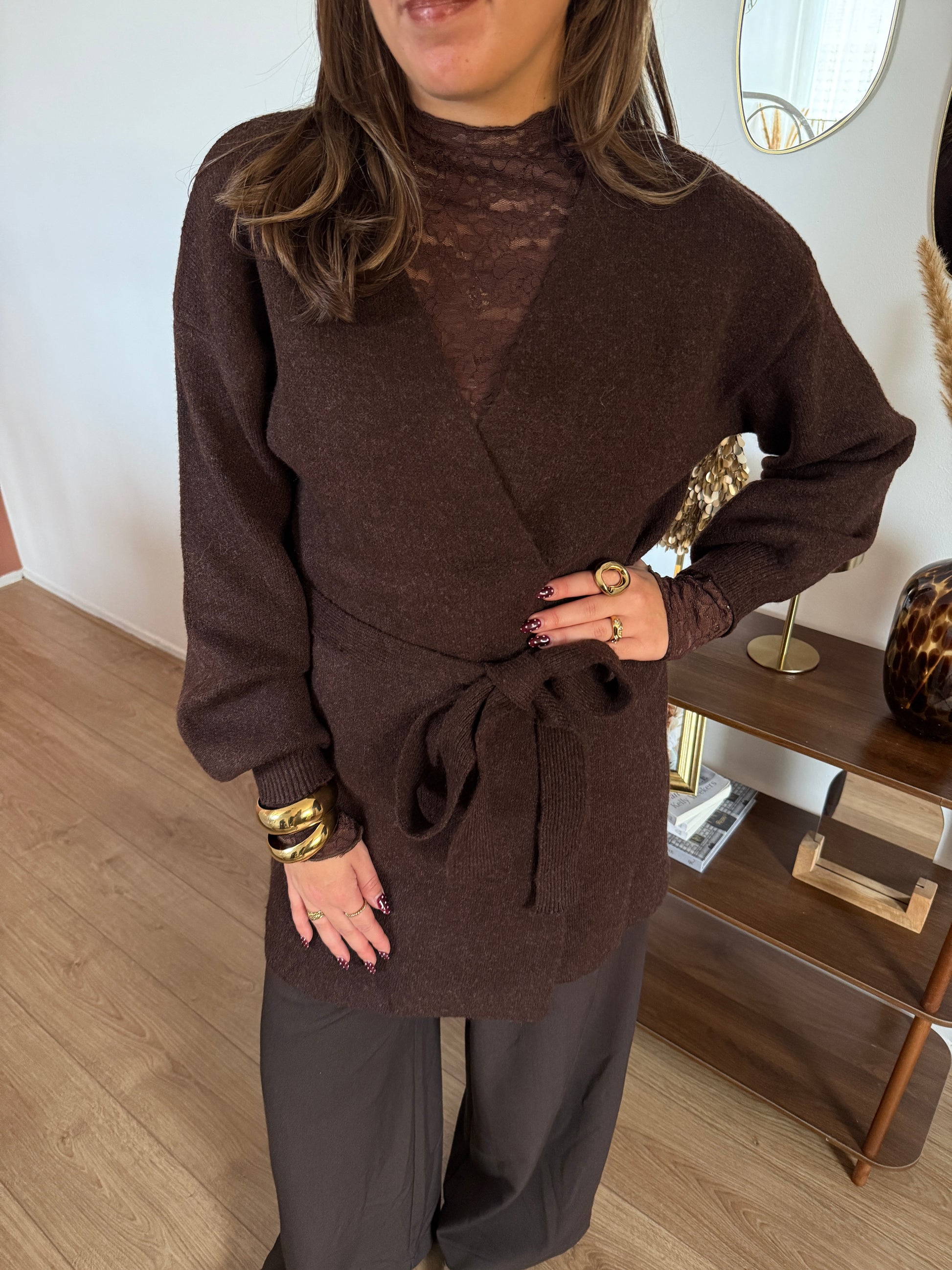 Dit overslagvest in bruin is mega cozy! ✨ Het langere model valt mooi over de heupen en zorgt voor een comfortabele pasvorm. Perfect om casual te dragen over een top en jeans of als extra laagje over een jurk.